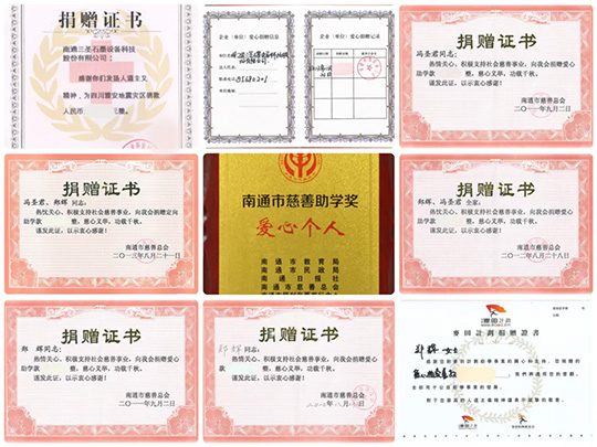 近二十年來,南通三圣企業(yè)集團(tuán)通過設(shè)立專項(xiàng)基金、捐贈(zèng)物資、組織志愿者服務(wù)、參加公益活動(dòng)等多種形式,長期致力于教育助學(xué)、鄉(xiāng)村振興、應(yīng)急救援、環(huán)境保護(hù)、助老助困等領(lǐng)域發(fā)揮自己的光和熱,也曾受到政府各級(jí)的諸多表彰。